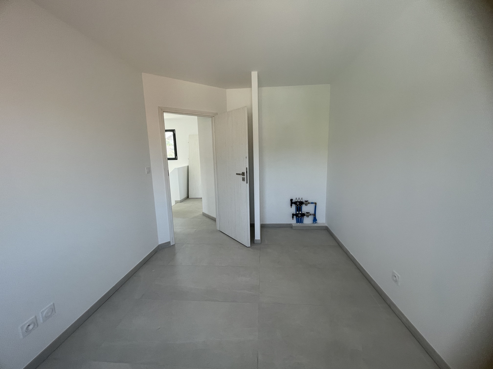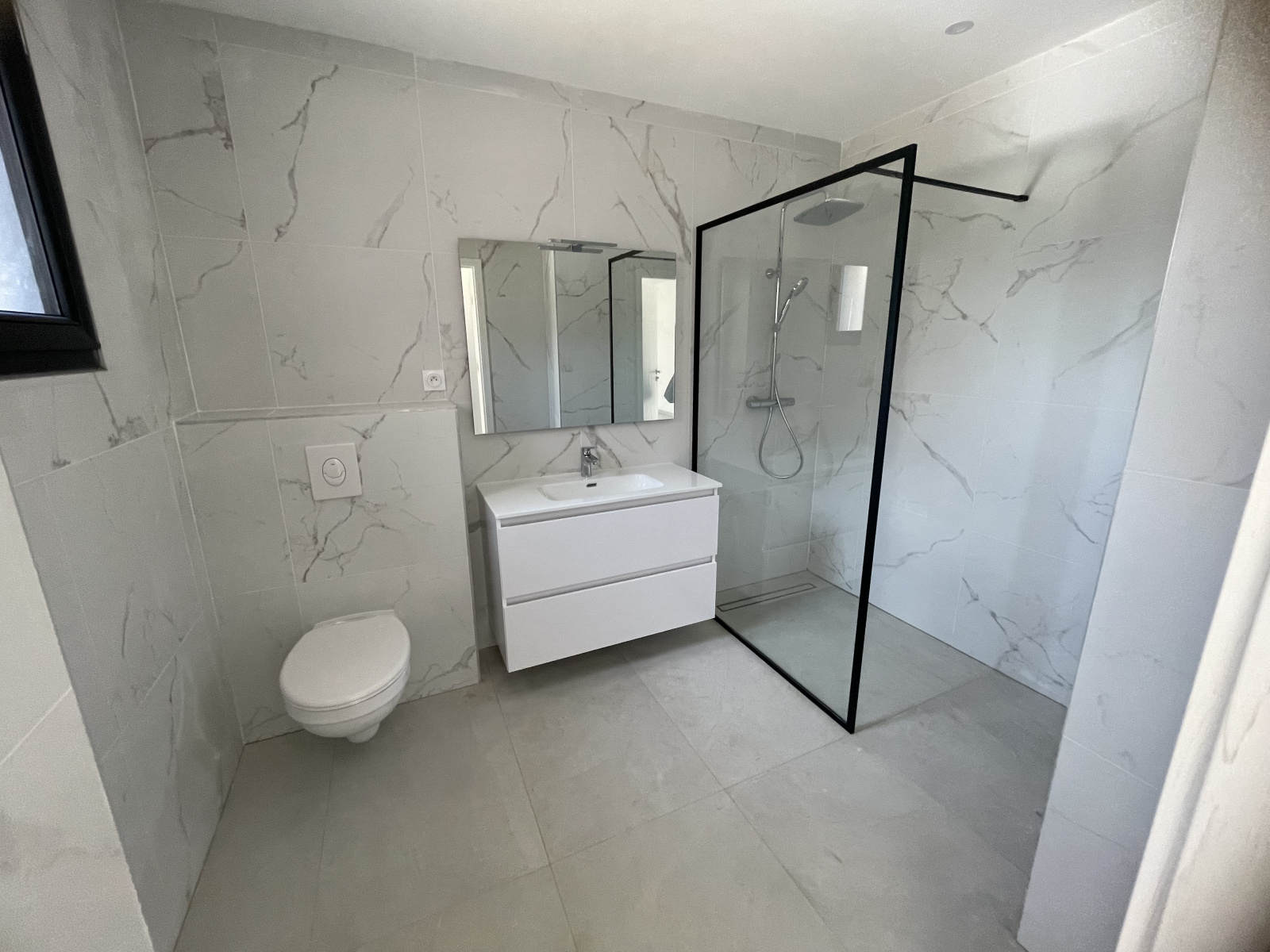 Elle est composée au rez-de-chaussée d'un séjour-salon-cuisine, une suite parentale, une salle de bains, un WC, au 1er étage, deux chambres, une salle de bains, un WC ainsi qu'un garage carrelé, une buanderie.