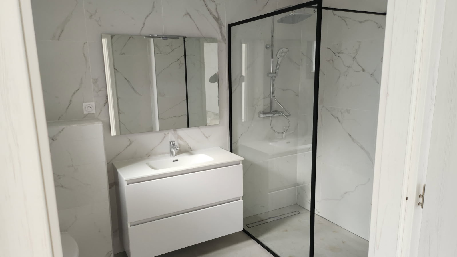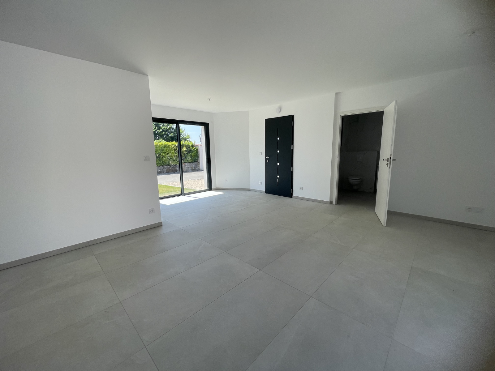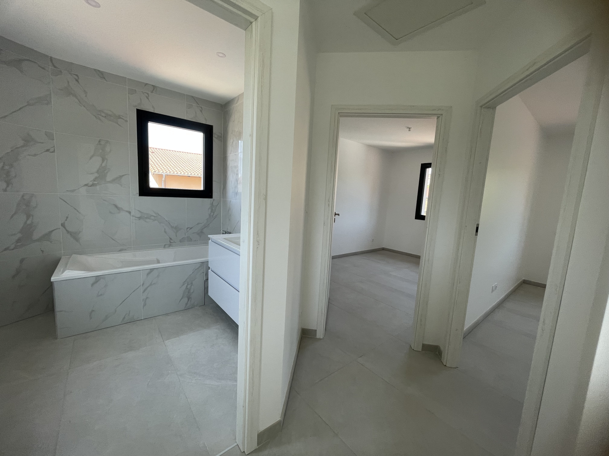 Elle est composée au rez-de-chaussée d'un séjour-salon-cuisine, une suite parentale, une salle de bains, un WC, au 1er étage, deux chambres, une salle de bains, un WC ainsi qu'un garage carrelé, une buanderie.