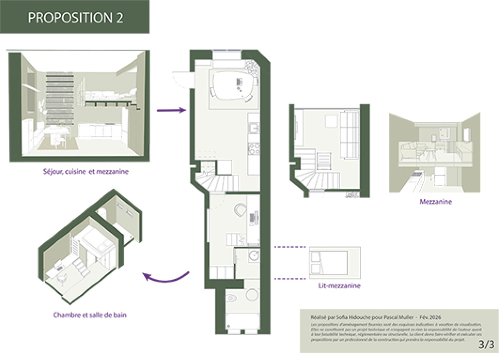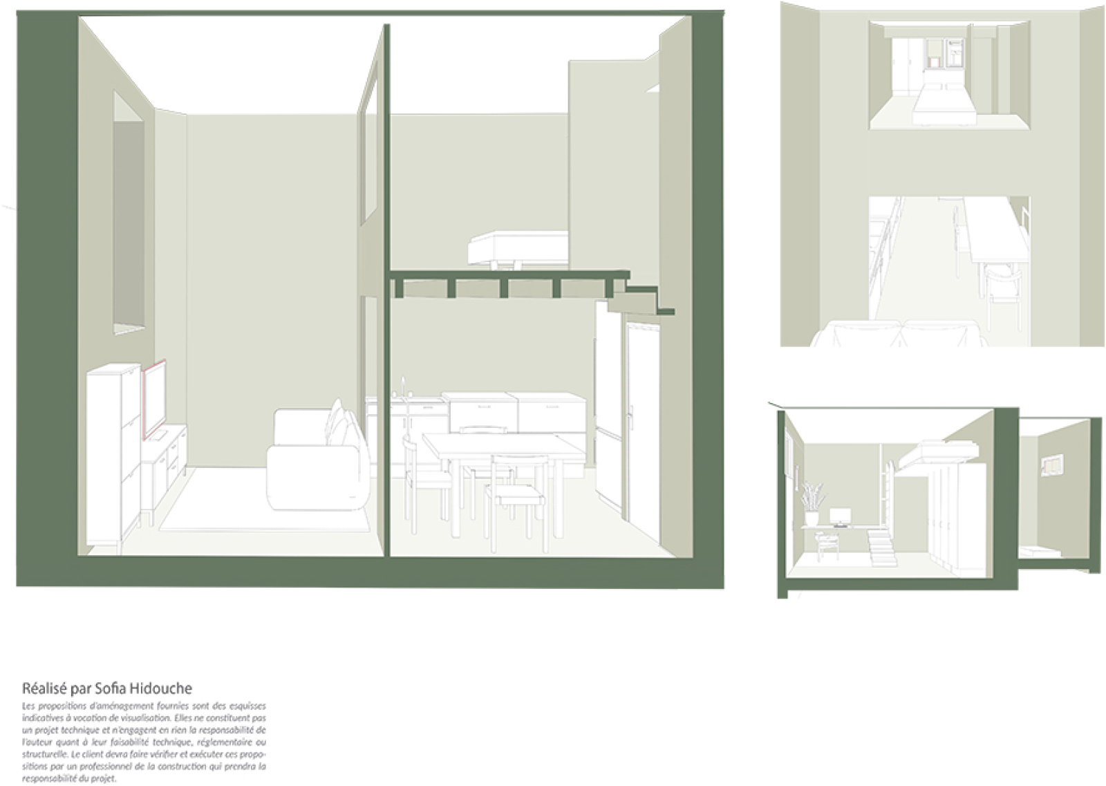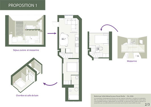 Ce logement est composé d'une pièce à usage de séjour avec une belle hauteur de plus de 4,20 m avec une mezzanine, d'un espace cuisine confortable, d'un espace nuit à l'étage permettant la création de deux pièces, salle d'eau et wc.